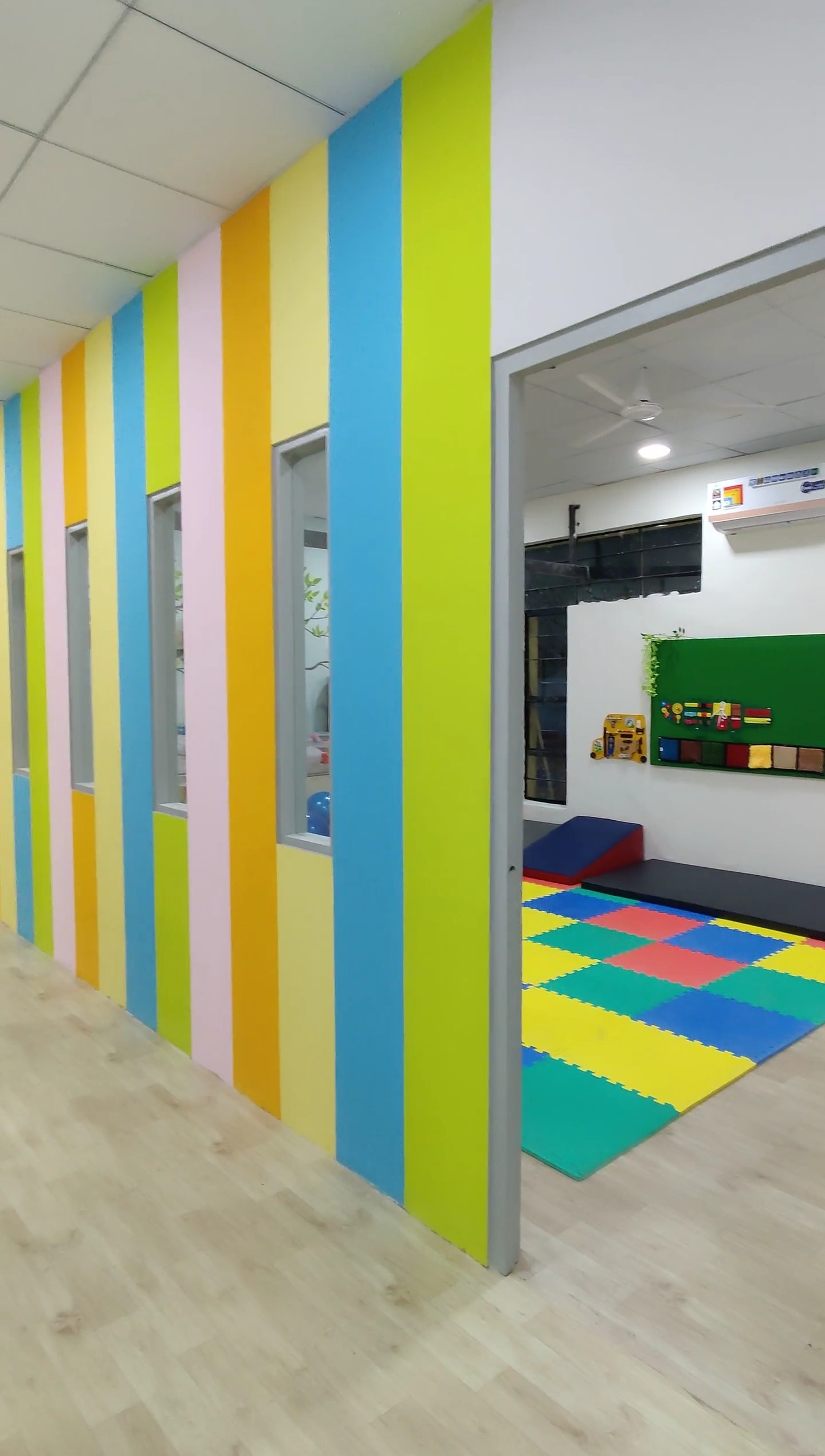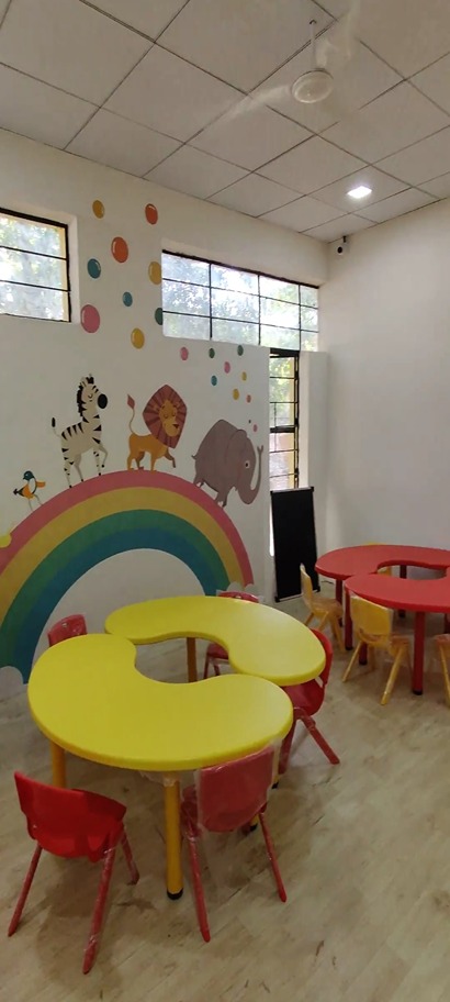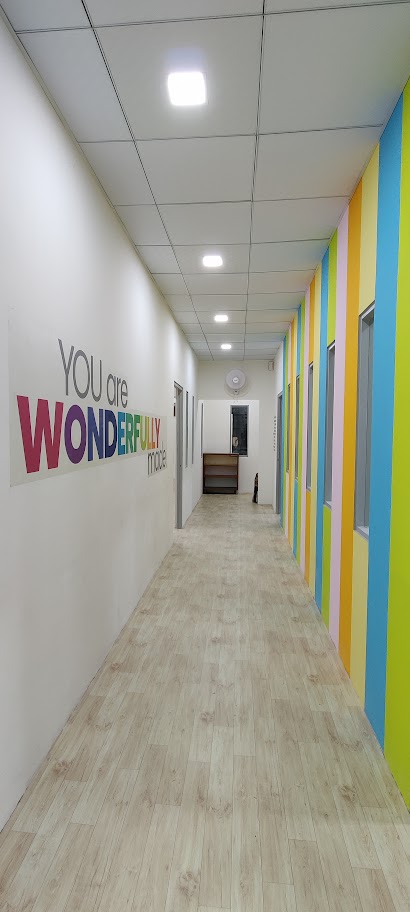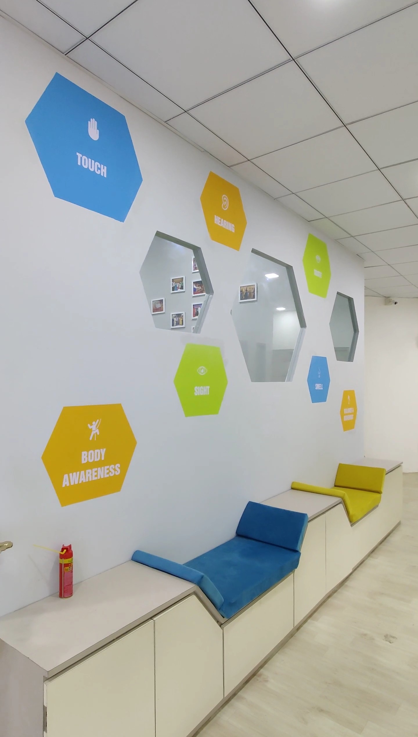 A School for Special Children, this bright and colorful space aims to cater to the needs of students with various developmental inabilities or special needs. A playful ambience creates a sense of curiosity and creative wayfinding amongst the students. Fundamentally, we're aware of the Five senses. The awareness wall at this Centre, talks about the other 2 senses -