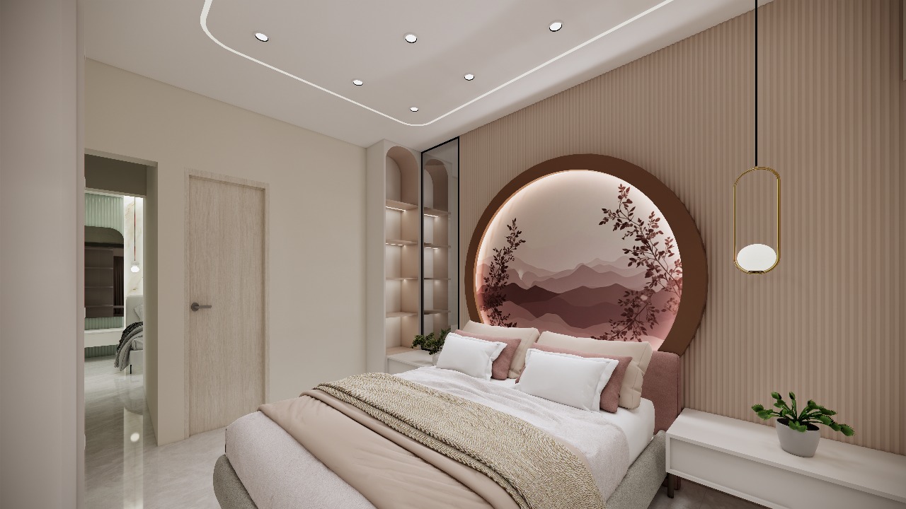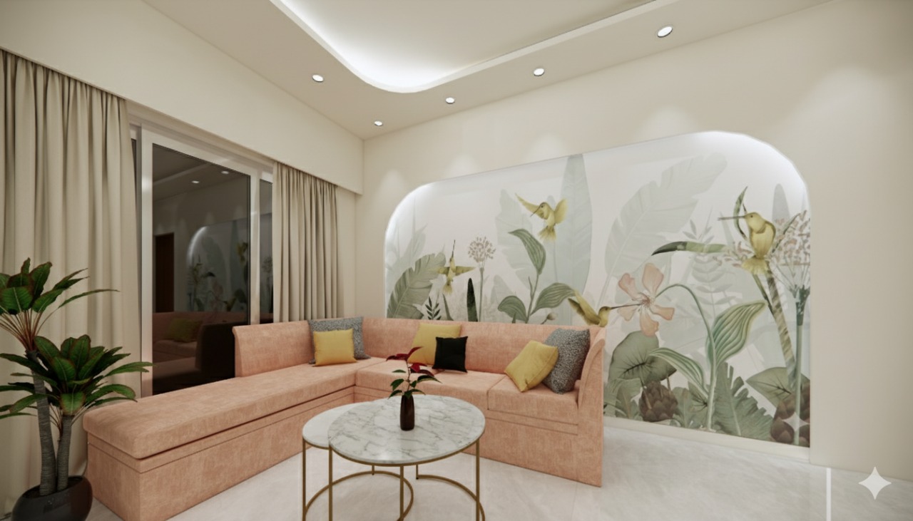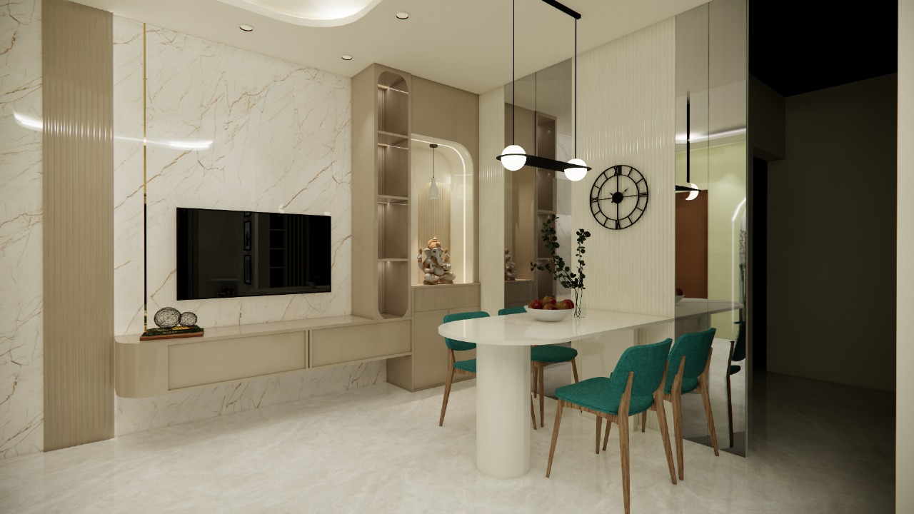 This apartment displays curved niches, soft color palette, creams, and natural woods as a base, allowing a massive botanical wall mural in the living room and a striking turquoise dining set to act as vibrant focal point. Every corner is designed to offer an oasis of organic calm.